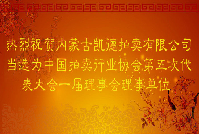 熱烈祝賀內(nèi)蒙古凱德拍賣有限公司當(dāng)選為中國拍賣行業(yè)協(xié)會(huì)第五次代表大會(huì)一屆理事會(huì)理事單位