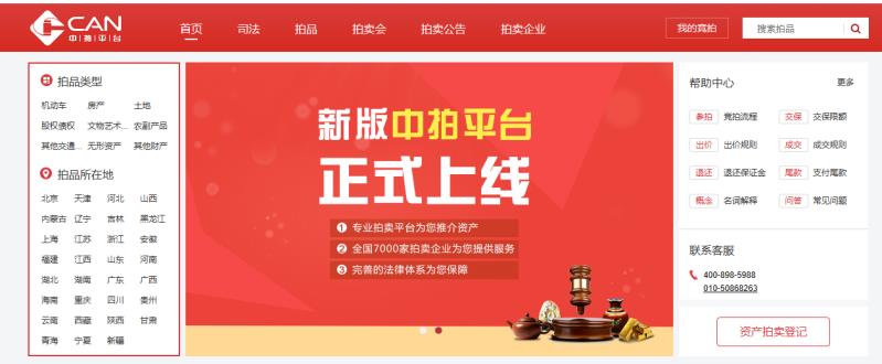 新版中拍平臺今日正式上線 由中國拍賣行業(yè)協(xié)會發(fā)起,并由拍賣業(yè)、金融業(yè)、大數(shù)據(jù)行業(yè)等著名企業(yè)共同創(chuàng)建的中拍平臺今日正式上線(paimai.caa123.org.cn)。新平臺是在原有網(wǎng)站架構(gòu)的基礎(chǔ)上融入市場思維,進(jìn)行的換代升級。新平臺上線后不但為拍賣企業(yè)提供了的互聯(lián)網(wǎng)競價工具,還將站在行業(yè)的高度加大與社會各界委托方的溝通與融合,為行業(yè)爭取到更多委托業(yè)務(wù),為拍賣企業(yè)提供更廣闊的資源整合平臺。 中拍平臺是最高院指定專業(yè)司法網(wǎng)拍平臺 中拍平臺系統(tǒng)于2011年建設(shè)并投入使用,平臺涉及了公共資源、金融資產(chǎn)、藝術(shù)品、土地、二手機(jī)動車、農(nóng)副產(chǎn)品、股權(quán)債權(quán)、二手物資等拍賣領(lǐng)域。2016年中拍平臺被最高人民法院指定為“專業(yè)網(wǎng)絡(luò)司法拍賣平臺”,即時,中拍平臺將帶動全國拍賣企業(yè)助力中國司法網(wǎng)絡(luò)拍賣管理規(guī)范。
