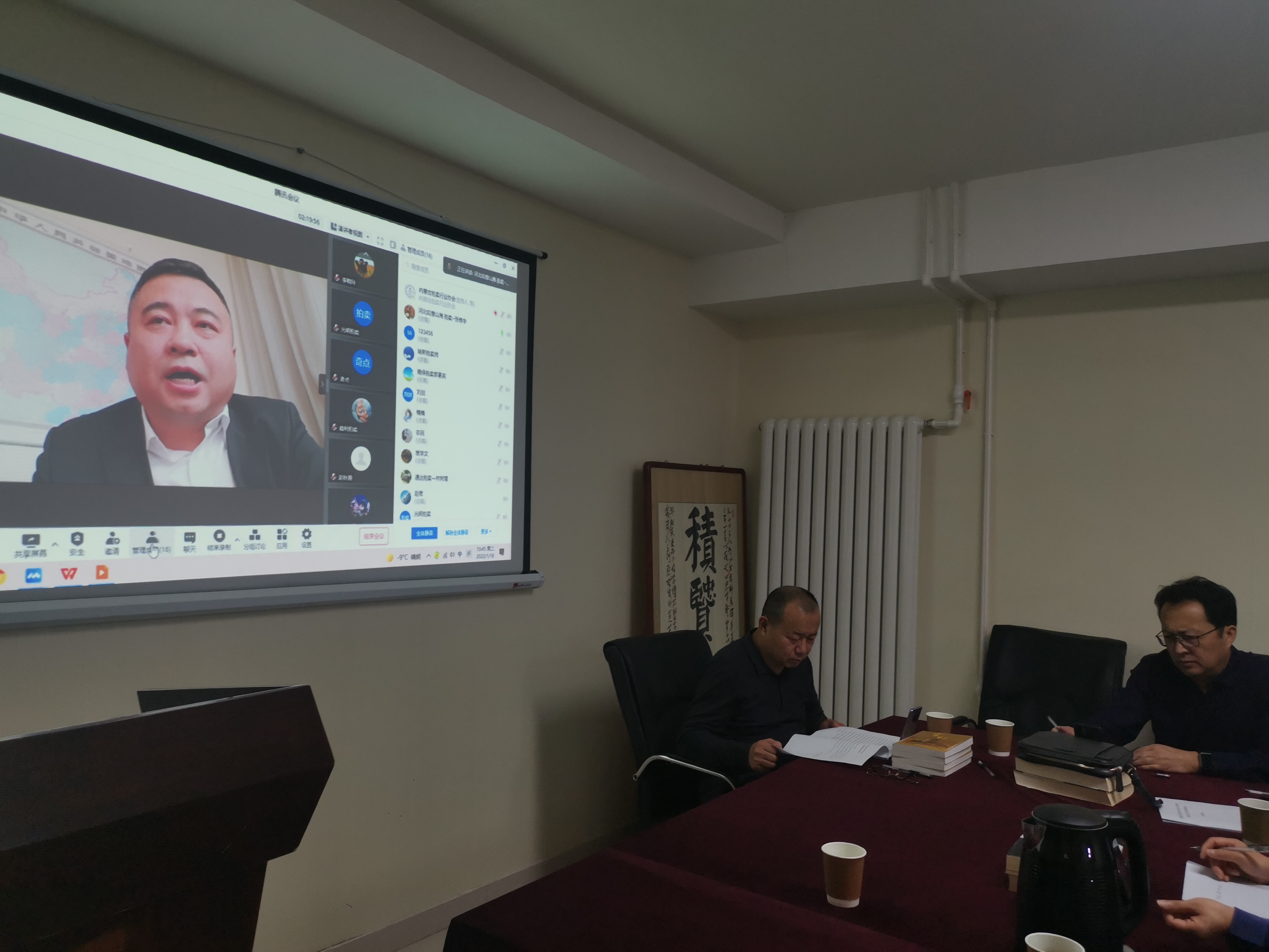 內(nèi)蒙古拍賣行業(yè)協(xié)會五屆六次理事會 暨五屆九次常務(wù)理會圓滿落幕 面對新冠肺炎疫情形勢依然復(fù)雜嚴峻且病毒傳播方式趨于多樣化,為了大家的安全考慮,同時也考慮到大家的工作時間安排,本次內(nèi)蒙古拍賣行業(yè)協(xié)會五屆六次理事會暨五屆九次常務(wù)理會采取了線上形式召開。 2022年1月18日上午9:30,會議準(zhǔn)時召開?,F(xiàn)場參會人員有會長王志江、秘書長娜晴、副會長趙軍、郭素英、理事劉忠;騰訊會議室線上參會人員有副會長王罡、裴學(xué)文、李曉玲、林樹增、王峰、趙秋霞、蘆真、高燕剛、劉劍、張福忠;理事劉俊峰、張宏宇、哈斯格日勒圖;共計18人參會,符合《章程》會議召開規(guī)定。 會議由娜晴秘書長主持召開,娜晴秘書長表示由于疫情原因我們沒能面對面交流,但是我們采取線上線下相結(jié)合的會議模式,大家在網(wǎng)絡(luò)會議室一樣可以暢所欲言,為我們行業(yè)建言獻策。